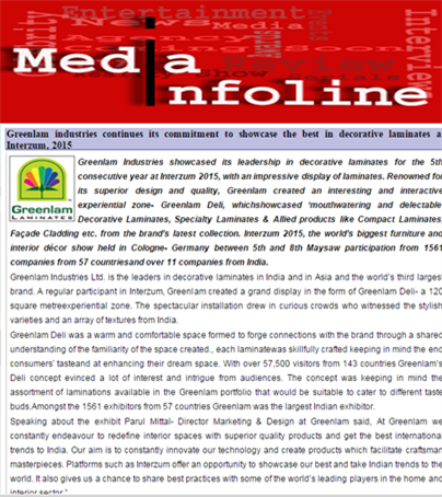 Greenlam industries continues its commitment to showcase the best in decorative laminates at Interzum, 2015